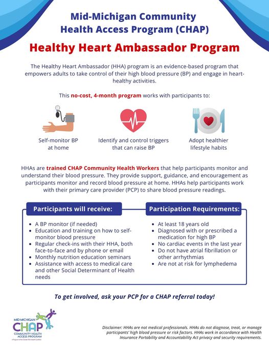 The Mid-Michigan Community Health Access Program offers a Healthy Heart Ambassador Program, which teaches individuals about blood pressure self-monitoring and making healthy lifestyle choices. To get involved, ask your PCP for a CHAP referral today!