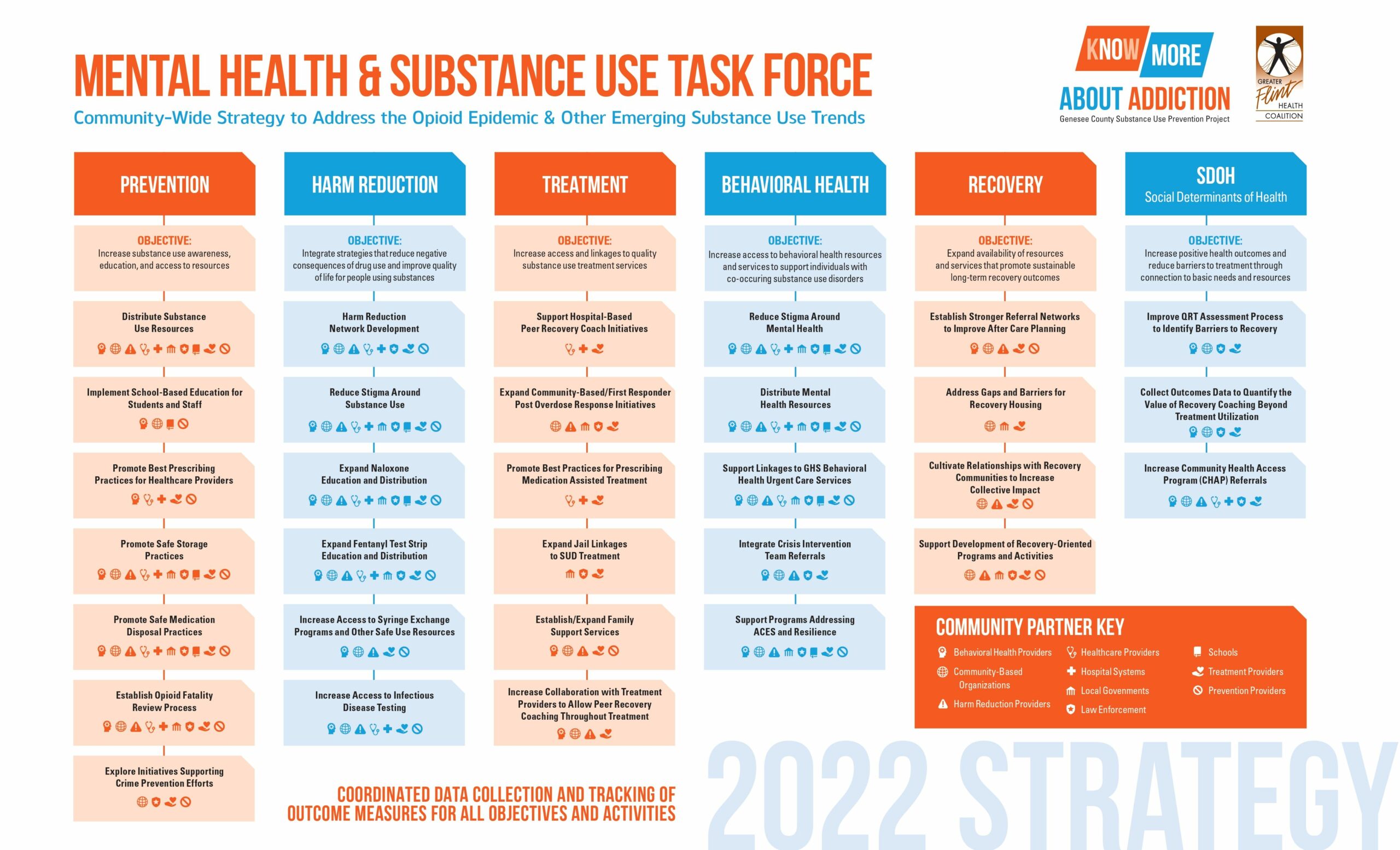 In response to the ongoing opioid epidemic, the Mental Health and Substance Use Task Force developed a community-wide strategy to show the importance of cross-sector collaboration in regard to sustainable and tangible outcomes. The Community Wide Strategy involves collaboration between multiple sectors including prevention, harm reduction, treatment, behavioral health, recovery, and social determinants of health. This is a collaborative, multi-sector effort to build and strengthen current workforce capacity, utilize upstream prevention strategies, and create an innovative, integrated system to improve access to treatment for and prevention of the misuse of opioids and other substances.